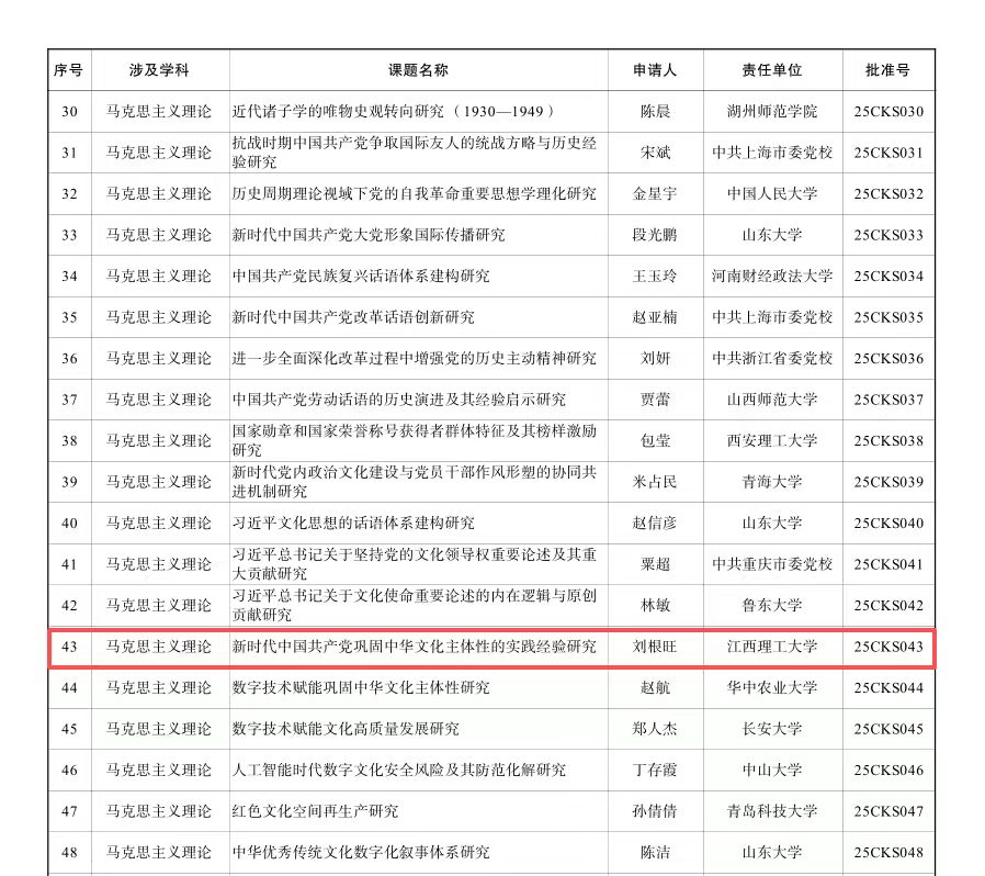在国家社科基金项目方面,刘根旺老师主持的“新时代中国共产党巩固中华文化主体性的实践经验研究”成功入选国家社科基金青年项目。