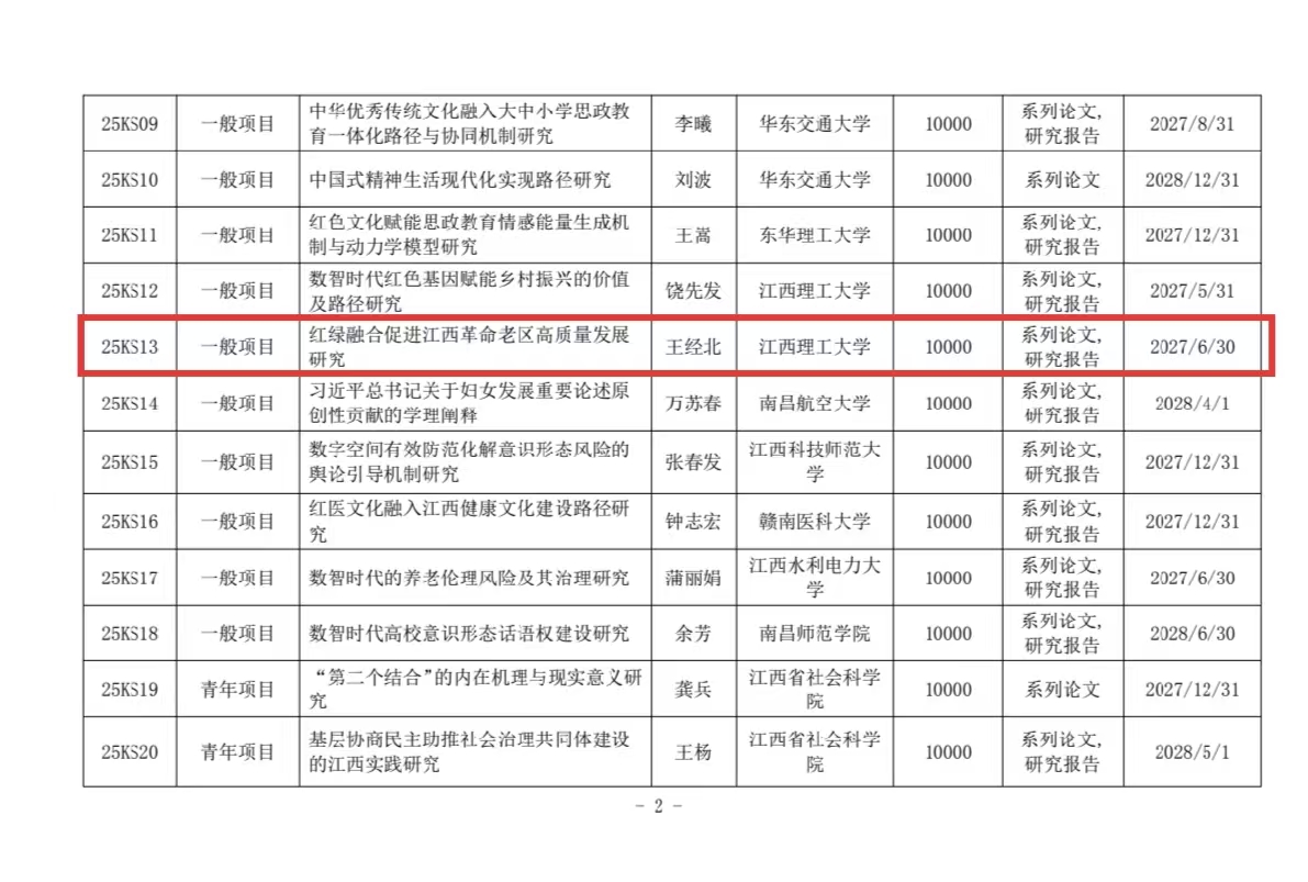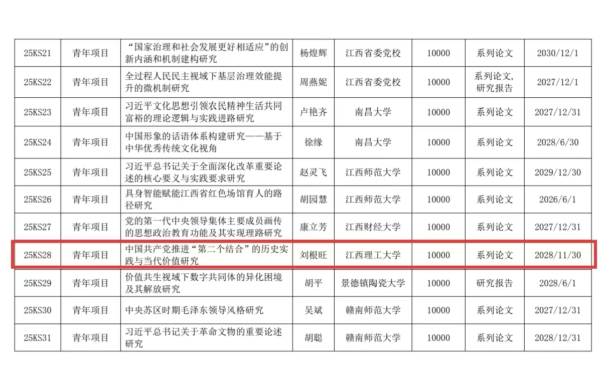 在江西省社科基金项目方面,我院共有3个项目立项,分别为:王经北老师申报的“红绿融合促进江西革命老区高质量发展研究”获批2025年江西省社会科学基金一般项目,刘根旺老师申报的“中国共产党推进‘第二个结合’的历史实践与当代价值研究”与朱贤凌老师申报的“中央苏区时期干部教育培训教材体系建设的历史经验与当代启示”双双入选青年项目。