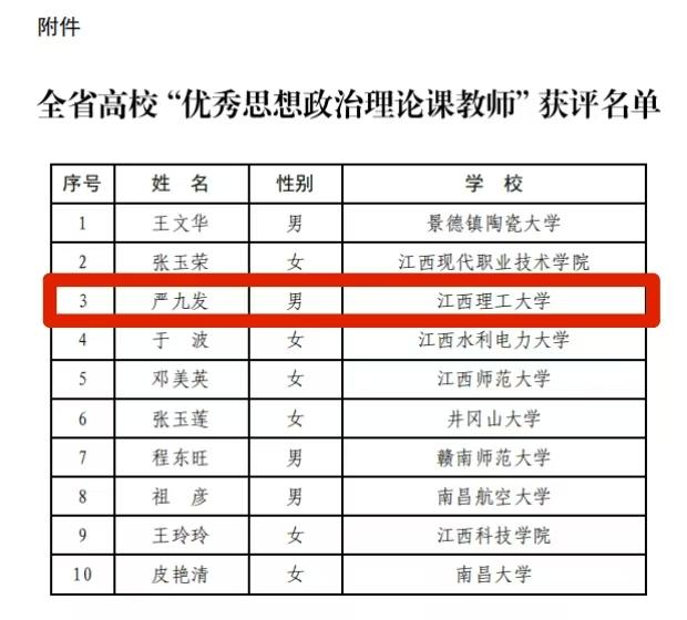 近日,江西省教育厅公布了全省高校“优秀思想政治理论课教师”评选结果,我院严九发老师入选全省高校“优秀思想政治理论课教师”。此次入选既体现了严九发老师长期深耕思政课教学科研一线的积极作为,也充分彰显了学院在教师队伍建设方面的积极成效,为我院人才成长发展注入了新动能。