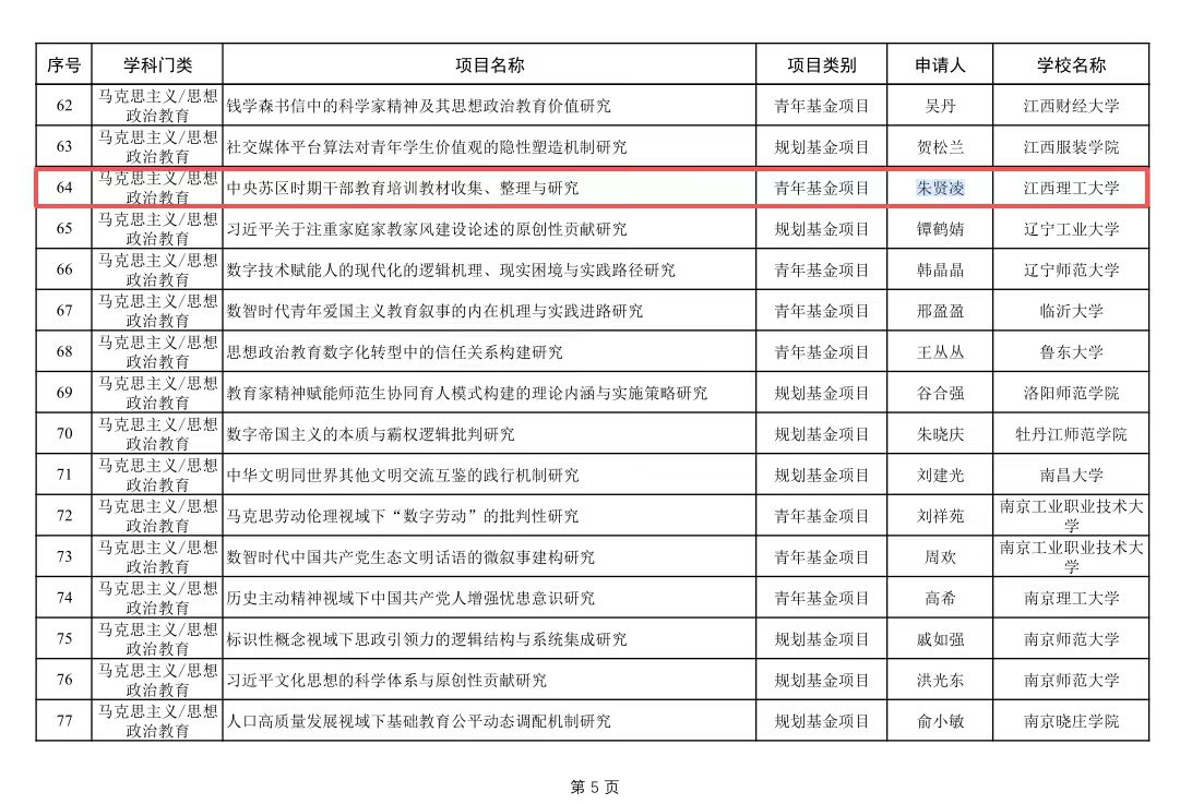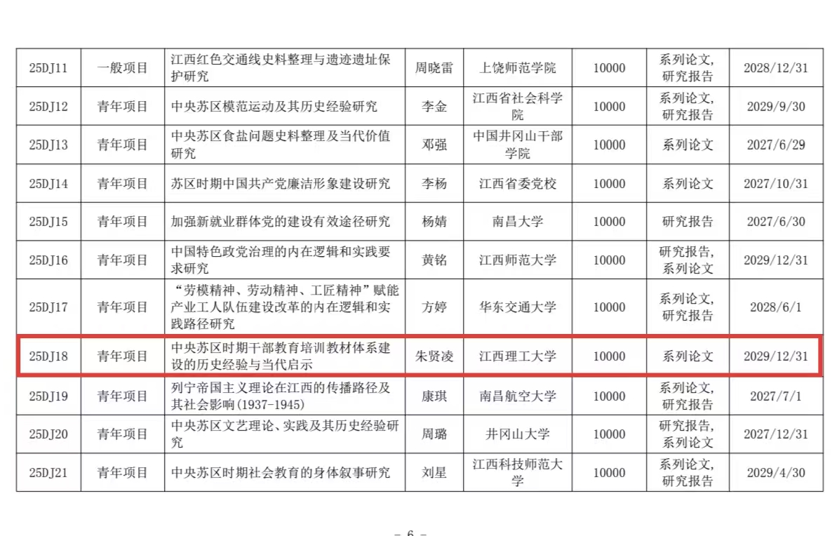 在教育部人文社科研究项目方面,教育部社会科学司正式公示了2025年度教育部人文社会科学研究一般项目评审结果,朱贤凌老师申报的“中央苏区时期干部教育培训教材收集、整理与研究”成功获批教育部人文社会科学研究青年基金项目。