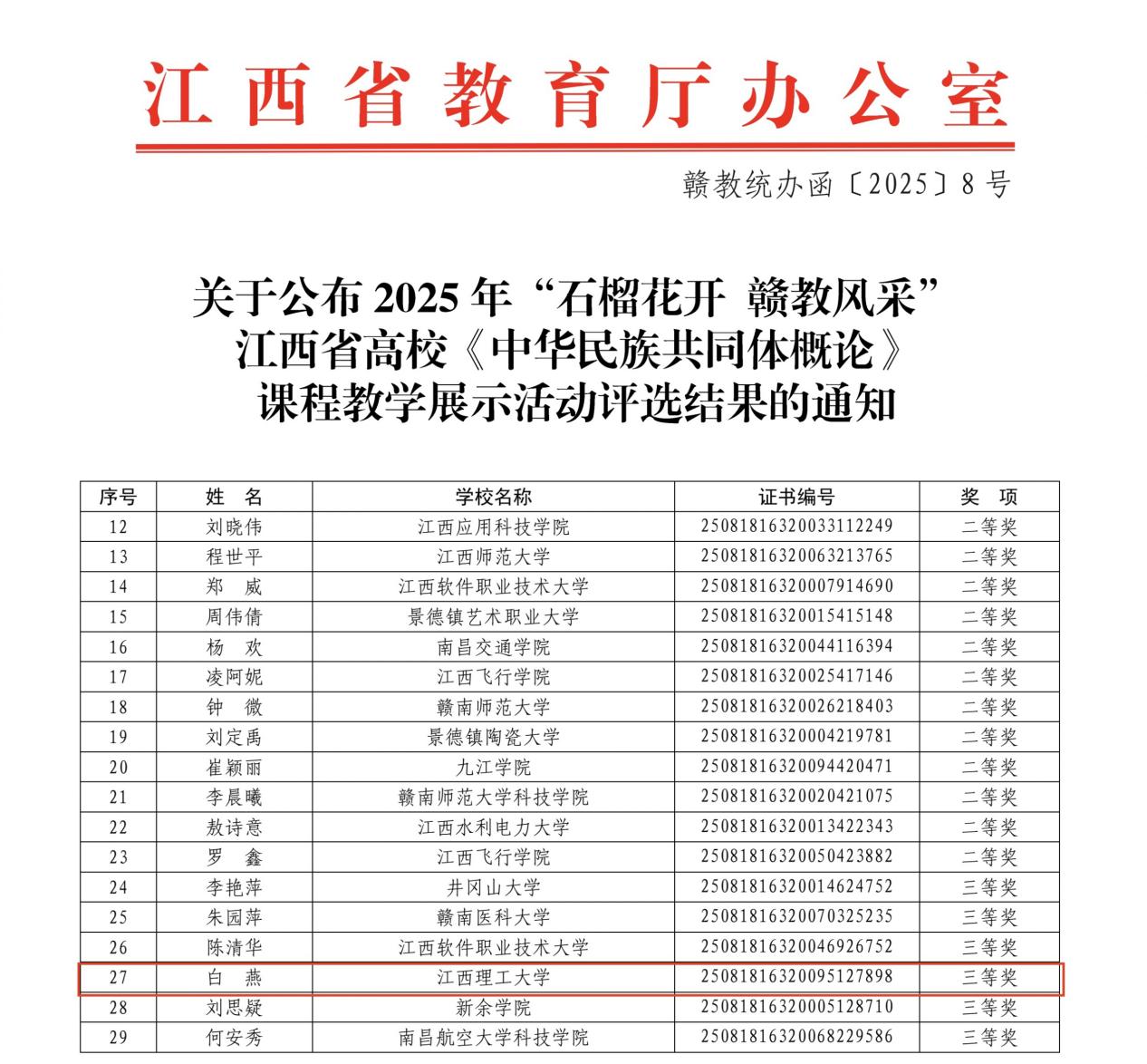 在2025年“石榴花开 赣教风采”江西省高校《中华民族共同体概论》课程教学展示活动中,我院白燕老师获得三等奖。