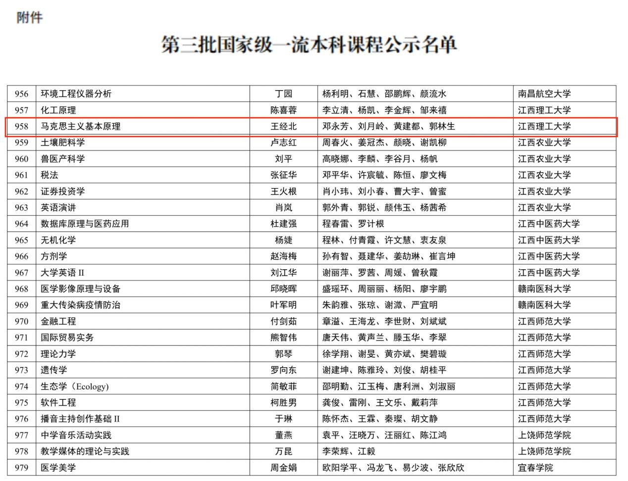 近日,教育部发布《关于第三批国家级一流本科课程认定结果的公示》,我院王经北教授团队主讲的《马克思主义基本原理》课程成功入选国家级线上线下混合式一流本科课程。这是继王霞副教授团队主讲的《中国近现代史纲要》课程被认定为国家级线上线下混合式一流本科课程之后,我院在国家级一流本科课程领域斩获的又一重要成果,标志着我院课程建设迈上新台阶。