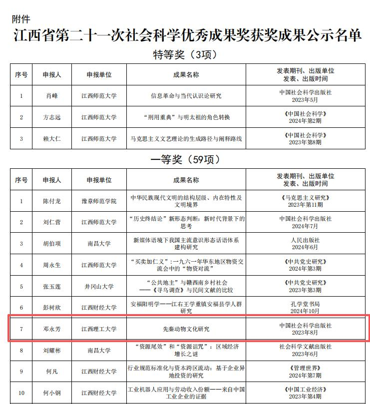 在江西省第二十一次社会科学优秀成果奖评选中,我院邓永芳副教授《先秦动物文化研究》一书荣获江西省社会科学优秀成果一等奖,这是我院首次突破一等奖。该书以马克思主义唯物史观为基础,系统梳理先秦动物文化的历史演进与文明价值,充分展现了我院在优秀传统文化研究方面的底蕴和成果。