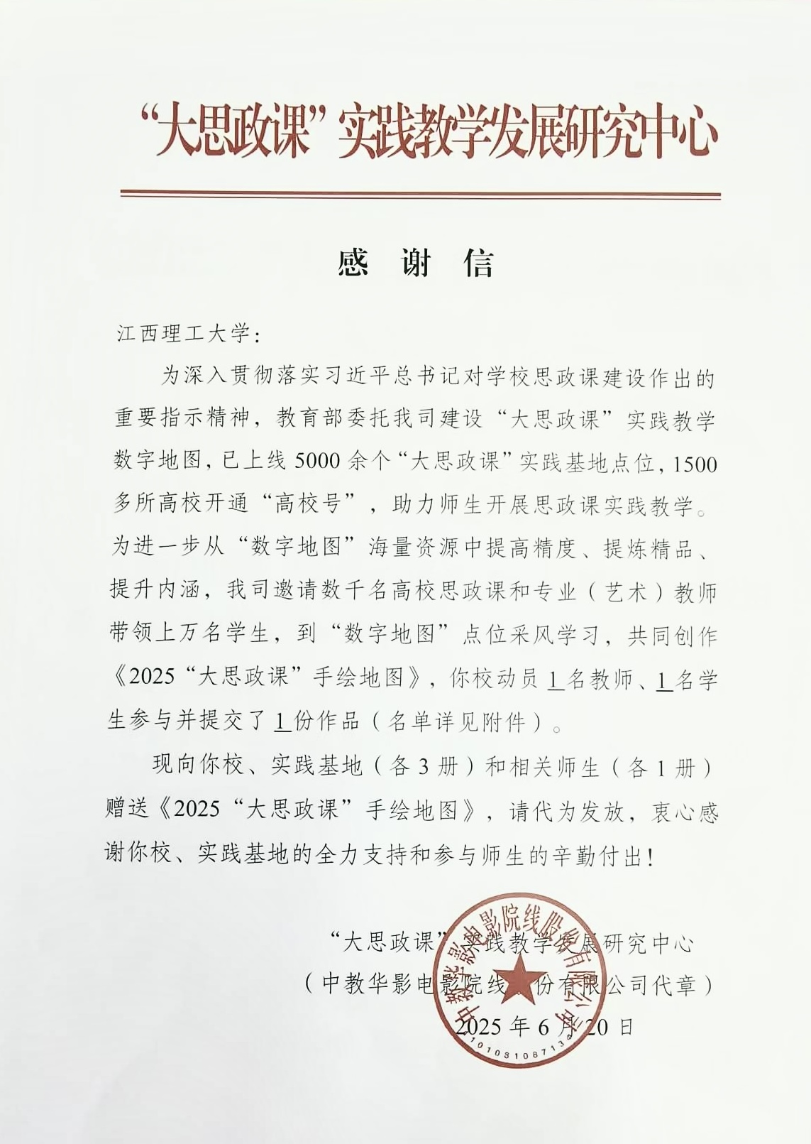 此次入选,是对我院创新开展“大思政课”实践教学工作的充分肯定。教育部“大思政课”实践教学发展研究中心(中教华影电影院线股份有限公司)特向我院发来感谢信。