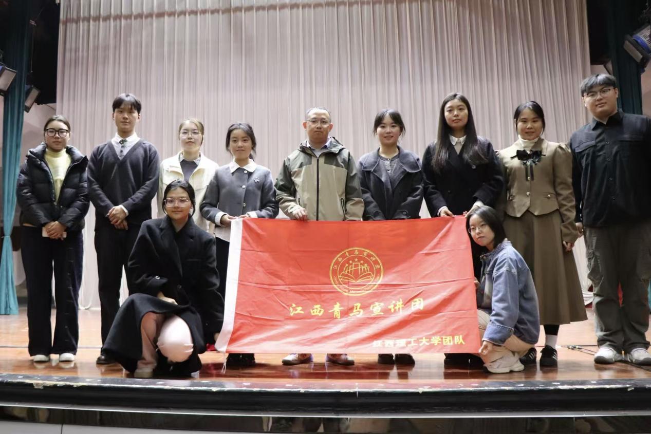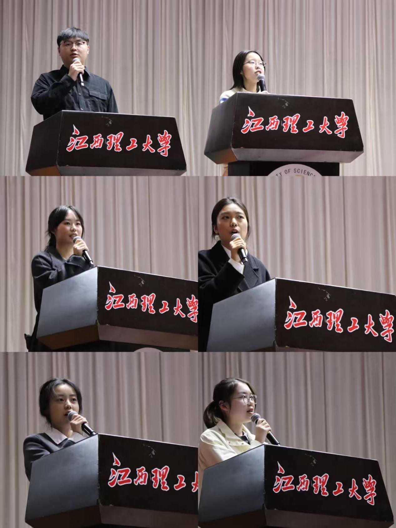 江西青马宣讲团江西理工大学团队成员分别上台宣讲。许嘉骏从“素袍铸忠魂”视角,讲述烈士王海纹舍弃优渥生活、以文艺为刃投身革命,最终与八位女战友挽手投河的壮烈事迹。刘旻雯聚焦“稀土铸强国”,宣讲赣南依托“赣南实验室”等高端平台推动产业升级的实践路径以及江西理工大学深耕人才培养与技术攻坚的责任担当,带领现场师生探寻稀土背后的强国密码。王惠颖以“光伏映绿荒漠”为题,解析党的二十届四中全会绿色转型部署下,青海荒漠“光伏板发电、板下养羊”的生动实践,展现生态修复与经济增收双赢的中国治理智慧。林丹丹从“产业筑基强国路”出发,探索百年变局下“十五五”规划将“建设现代化产业体系”列为第一战略任务的内在逻辑,分析了我国产业面临的结构与循环挑战及规避空心化的现实需求,号召青年学子主动投身强国建设。冉苗苗剖析新质战斗力与新质生产力融合的时代要求,结合福建舰入列、新式装备亮相等实践,分析其对国家安全、应对战争变革的重要意义,进一步坚定了青年学子为强军兴军、民族复兴贡献力量的信念。邵嘉仪结合“赣超”足球赛点燃全民热情的盛况,阐释其作为“体育+文旅”融合的生动实践——赛场传唱红色旋律、带动全域消费、凝聚十一城人心与力量,构建独具特色的区域发展赣州新模式。