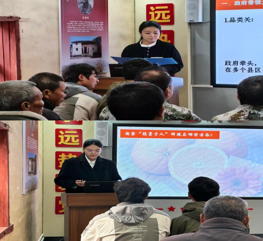 随后,我院青马宣讲团在村委会会议室开展宣讲。宣讲团成员林丹丹、李磊围绕党的二十届四中全会精神,并结合赣南脐橙产业发展实际,就“投资于物和投资于人紧密结合”的重要理念,详细讲解了国家在健康保障、技能培训、民生兜底等方面的惠民政策。同时,介绍了赣南脐橙从品类培育、品质提升到品牌打造的发展历程,生动体现了在党的领导、政府引领、科技赋能以及双循环格局下赣南脐橙产业高质量发展成果与乡村振兴成效。